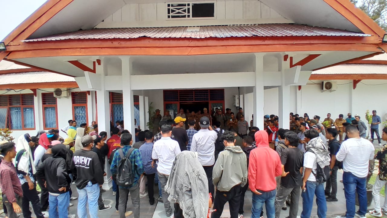 Aliansi Mahasiswa dan Pemuda Bersatu (AMPB) saat menggelar aksi damai sebagai bentuk dukungan terhadap kepemimpinan Bupati Buton Selatan, H. Adios di halaman Kantor Bupati Buton Selatan, Senin (20/10). (Foto Anto)