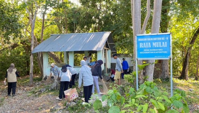 Aksi bersih-bersih tersebut dipusatkan di sekitar area makam yang ditandai dengan papan nama bertuliskan “Makam Raja Buton Ke-V Raja Mulai, Desa Boneatiro, Kecamatan Kapontori.”